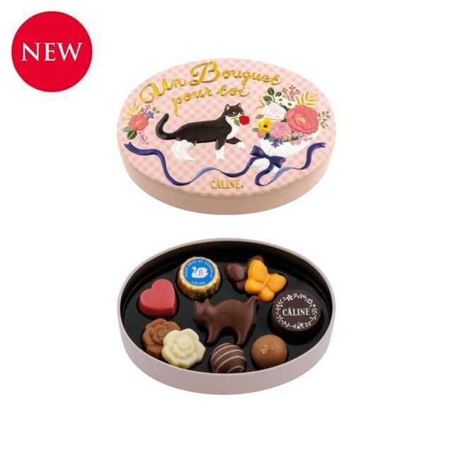花をくわえた猫が印象的な淡いピンクの缶パッケージに、ハートやバラ、猫の形のチョコレートなど色とりどりのチョコレートを詰め合わせました。