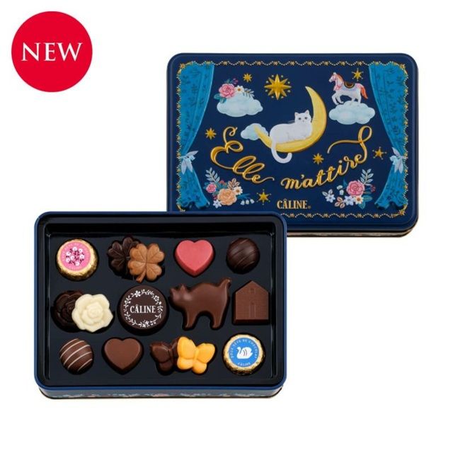 三日月に乗った猫を描いた幻想的なネイビーの缶パッケージに、ハートやバラ、猫の形のチョコレートなど色とりどりのチョコレートを詰め合わせました。