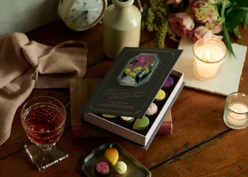 花びらが詰まったようなチョコレート箱。カクテルをイメージしたチョコで、お花の香りとカクテルの風味と両方を味わえて口の中がとっても華やか。