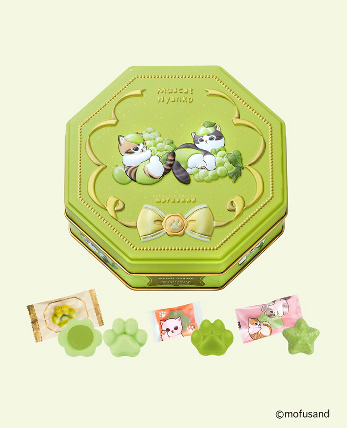 八角形のエンボス缶に、マスカット風味の肉球型グミチョコレート、クランチ、肉球型グミをアソートしました。