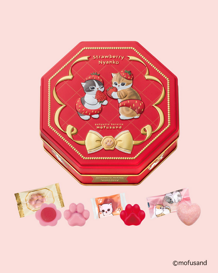 八角形のエンボス缶に、いちご風味の肉球型グミチョコレート、クランチ、肉球型グミをアソートしました。