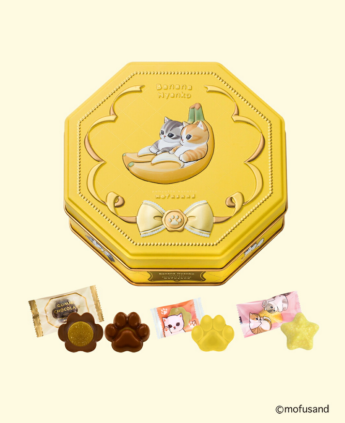 八角形のエンボス缶に、バナナ風味の肉球型グミチョコレート、クランチ、肉球型グミをアソートしました。