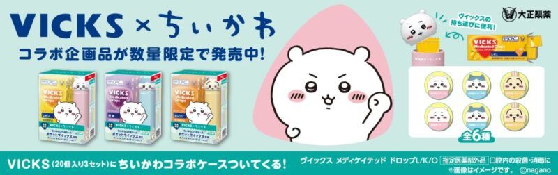 ヴイックス メディケイテッド ドロップ(20個入り×3セット)に、のどの不快感などが気になるこれからの季節に持ち運びにも便利なちいかわコラボケース「ポケットヴイックス」が付いた【オリジナル企画品】を数量限定で発売します(全6種)。