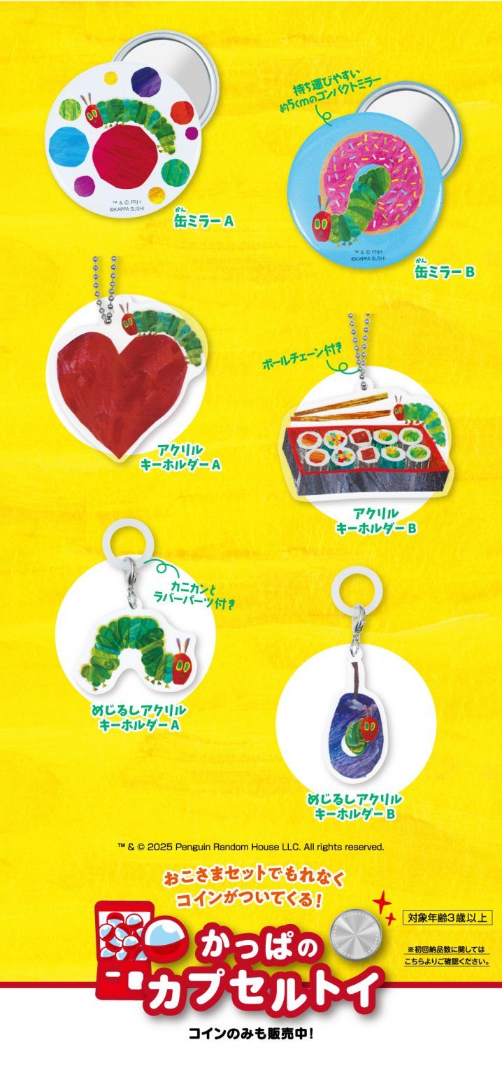 かっぱ寿司は、世界中で愛され続ける絵本作家エリック・カールの代表作「はらぺこあおむし」の世界観をモチーフにした「はらぺこあおむし アソートコレクション」を全国のかっぱ寿司の店内に設置している「かっぱのカプセルトイ」にて展開します!
