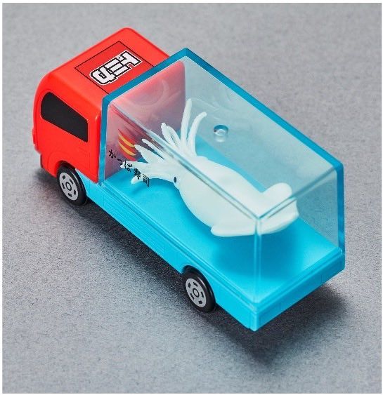 トラックの荷台には、暗いところで光るイカが乗っています!