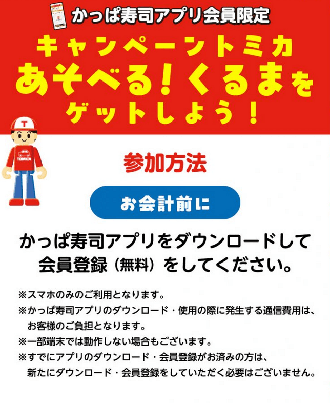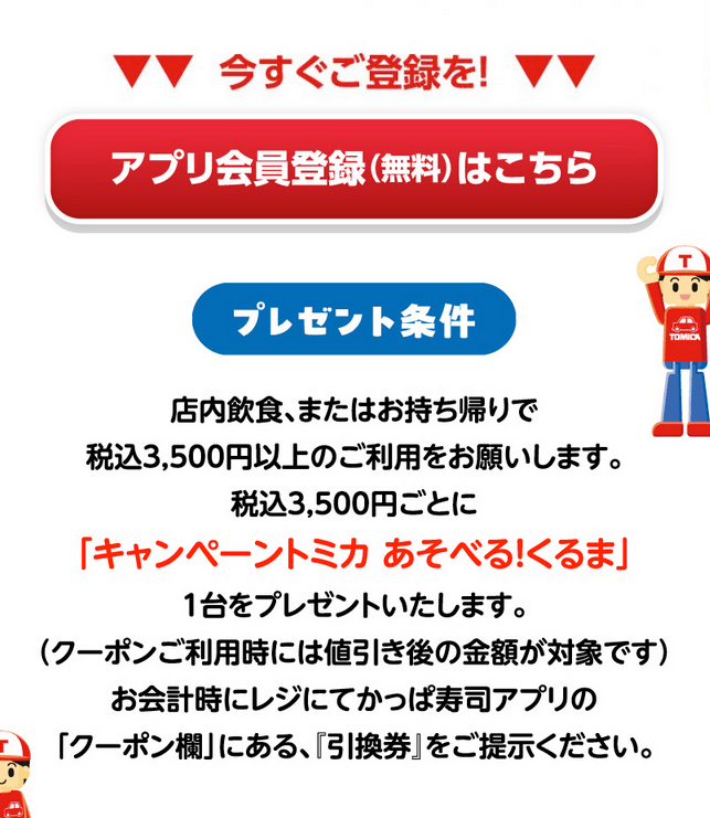カッパ寿司のアプリをダウンロードの上、店内飲食、またはお持ち帰りで税込み3500円ごとに、「キャンペーントミカ あそべる!くるま」1台がもらえます!