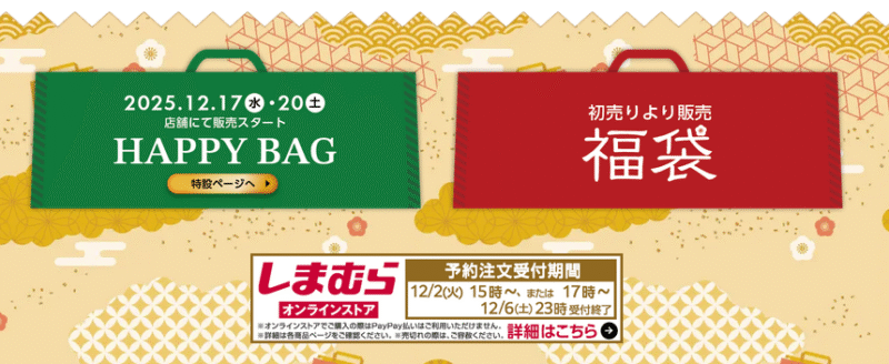 | 2026年 | 12月2日(火)15時、17時より しまむらオンラインストアの先行販売 歳末ハッピーバッグ(福袋)12月17日(水)、12月20日(土)に分けて店頭販売 初売り福袋 1月1日の元日より店頭販売 | |