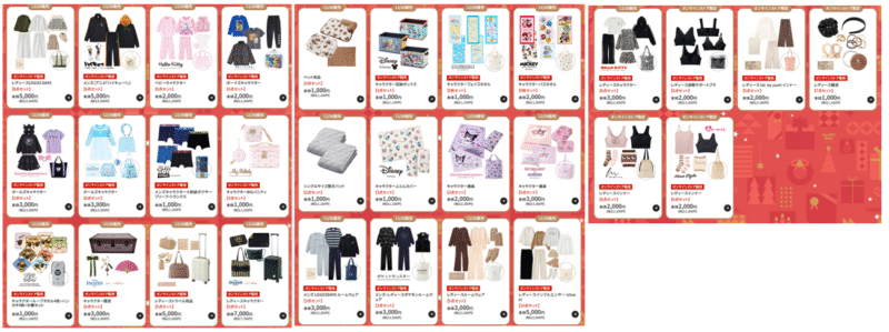 | 公式サイト | オンラインストア予約:12月2日(月) 商品により 15時スタート(キャラクターコラボなど) 17時スタート(インフルエンサー、ブランドコラボなど) 歳末に販売の福袋 2024年12月18日(水)店頭で発売 2024年12月21日(土)店頭で発売 初売りの福袋 2025年1月1日(水・元日)店頭で販売 |