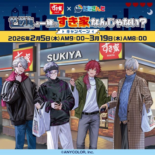 すき家が展開する牛丼チェーン店「すき家」は、2026年2月5日(木)AM9:00より、『にじさんじ』の“せめ4”とのコラボキャンペーン「せめ4と一緒にすき家なんじゃない?」を開催します。