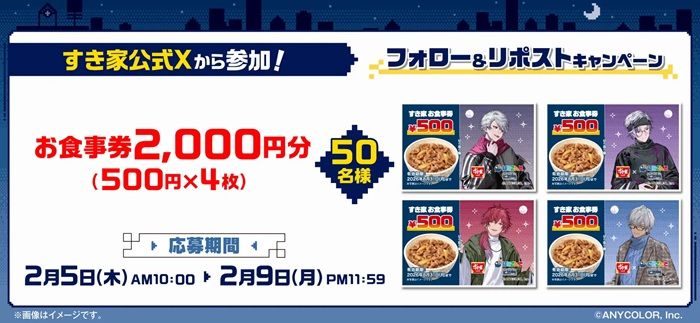 牛丼チェーン店「すき家」では、『にじさんじ』とのコラボキャンペーンが2026年2月に実施するようです。