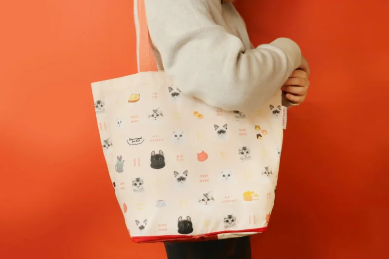 いつものお出かけが楽しくなる、可愛らしい2匹のねこに癒されるデザインです。お弁当や水筒を入れたり、買い物に使ったりするのもおすすめです。