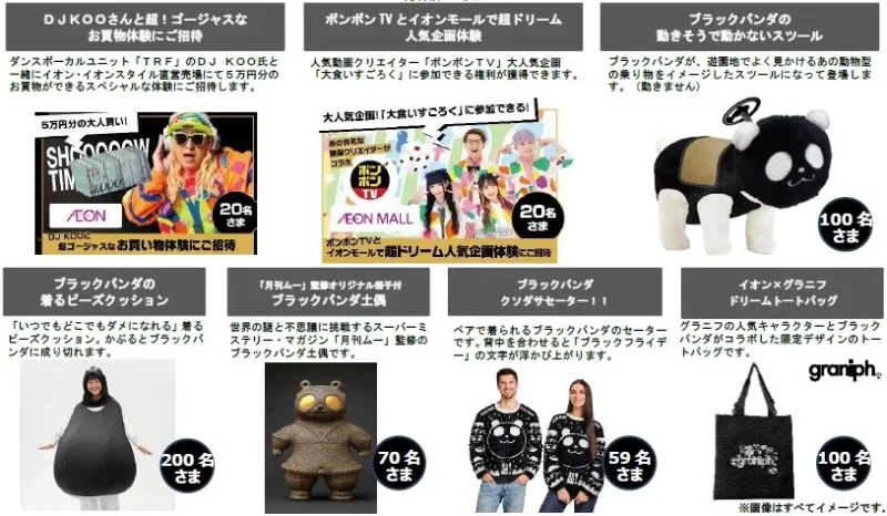 イオン ブラックフライデー10周年を記念したスペシャルなアイテムが当たる「イオン ドリーム キャンペーン」を開催します。当選者には「ブラックパンダ」や「黒」にまつわる、本キャンペーン でしか手に入らない限定アイテムを進呈します。対象期間中イオングループ各店舗にて、税込 3,000円または税込5,000円のお買上げレシート1口毎に専用サイトからキャンペーンに 応募(スマホ限定)できます。(全15コース 景品数 合計1,000名さま)