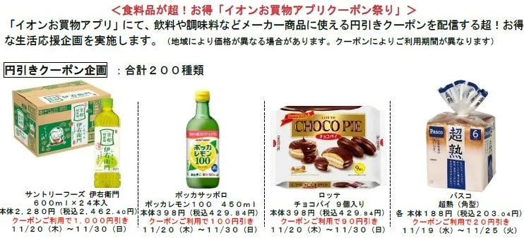 「イオンお買物アプリ」にて、飲料や調味料などメーカー商品に使える円引きクーポンを配信する超!お得 な生活応援企画を実施します。(地域により価格が異なる場合があります。クーポンによりご利用期間が異なります)