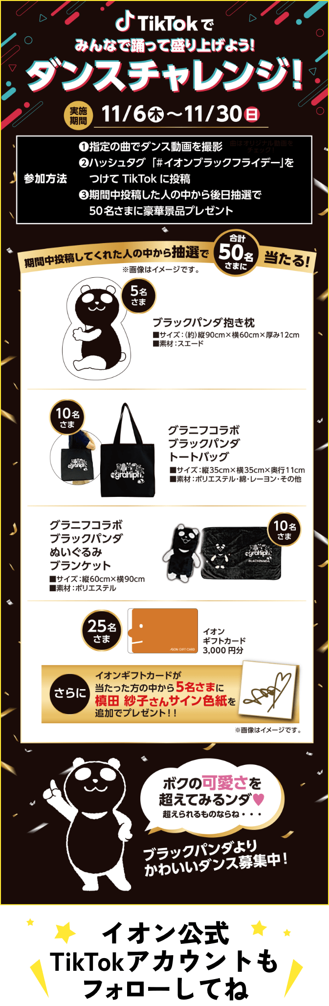 SNSを中心に多くのバズを生み出している人気振付師・槙田紗子さんに考 案いただいた振付のダンス投稿企画を 実施します。オリジナル楽曲をバック にダンスした動画を「#イオンブラックフライデー」のタグを付けて TikTok で投稿すると、後日抽選で豪華景品が当たります。