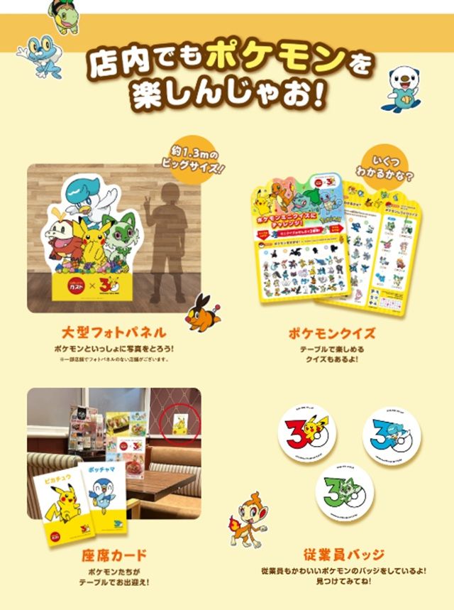 記念撮影ができるフォトパネルやポケモンの座席カード、親子で遊べるクイズなど、店内でも“ポケモンたちと出会うぼうけん”を楽しめます。
