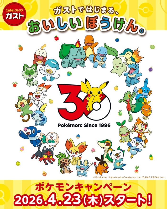 ガストでは、2026年4月23日(木)より、今年で30周年を迎え、次のテーマを「たべる」としている「ポケモン」とのキャンペーンを開催します。