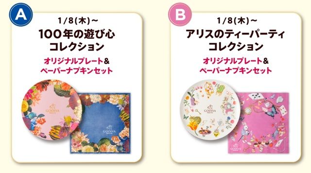 全国のゴディバショップ、GODIVA caféおよびゴディバ オンラインショップにて、「100年の遊び心 コレクション オリジナルプレート&ペーパーナプキン」または「アリスのティーパーティ コレクション オリジナルプレート&ペーパーナプキン」がもらえるキャンペーンを2026年1月8日(木)より実施します!