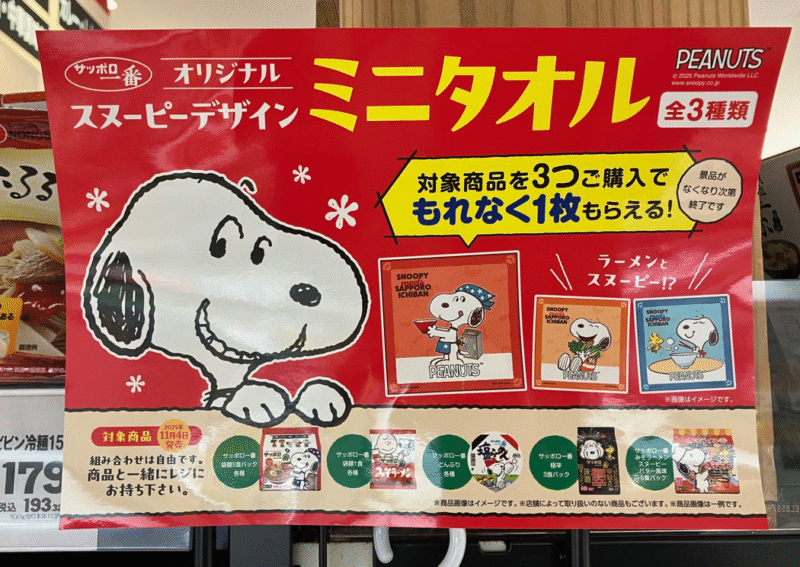 対象のサッポロ一番を3点購入すると、スヌーピーデザインのミニタオルが貰えるキャンペーンを実施していました。