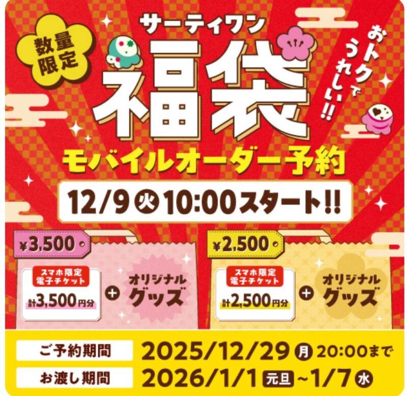 | 公式サイト | モバイルオーダー予約、店舗販売とも、なくなり次第終了となります。 商品名 :サーティワン福袋 2025 価格 :3,500円/2,500円※価格は税込表示です。 販売期間:モバイルオーダー予約:2024年12月10日(火)AM10:00~29日(日)※なくなり次第終了 ⇒店頭お渡し:2025年1月1日(水・元日)~7日(火) 店舗販売:2025年1月1日(水・元日)~期間限定販売 ※なくなり次第終了 |