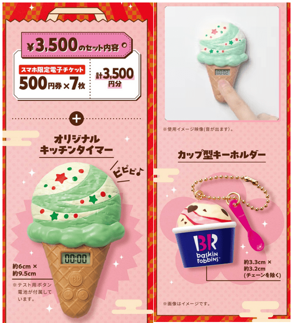 オリジナルグッズは、かわいいアイスクリーム型のキッチンタイマーやキーホルダーなど、おうちの中でも外でも使えてみんなに自慢したくなるアイテムをラインナップ。