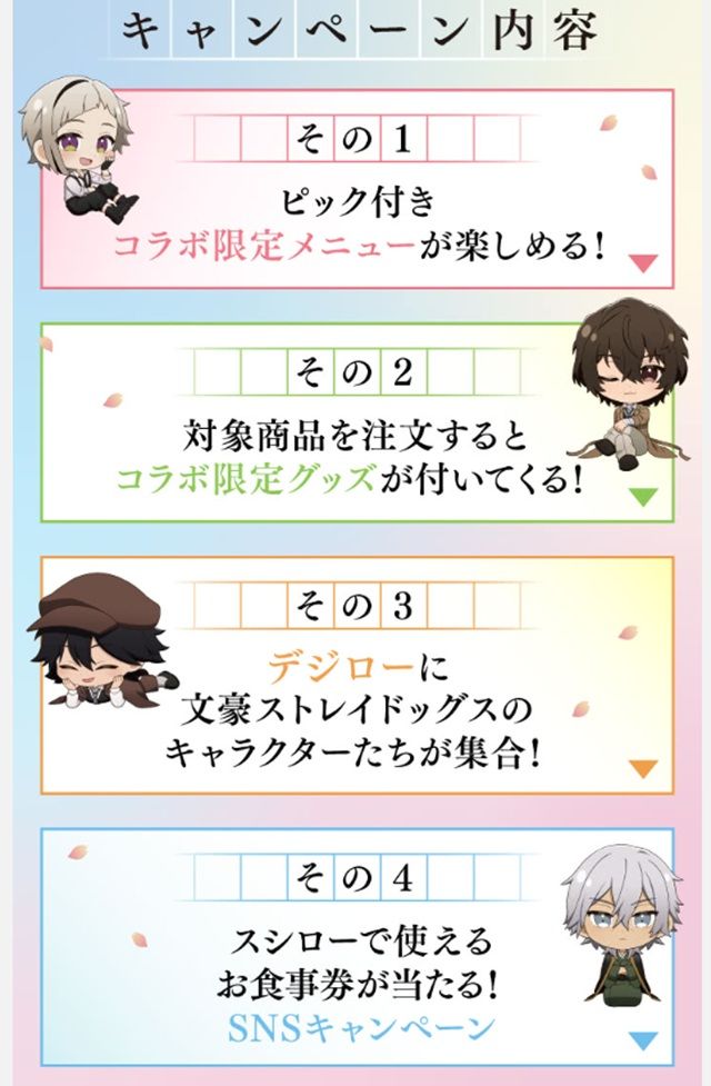 スシロー × 文豪ストレイドッグス コラボキャンペーン『春うらら、来たれスシロー。』で、探偵社、ポート・マフィアのメンバーが登場します!