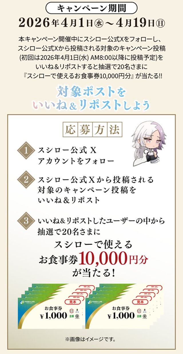 キャンペーン開催中にスシロー公式Xアカウントをフォローし、スシロー公式Xから投稿される対象のキャンペーン投稿(初回は2026年4月1日(水)AM8:00以降に投稿予定)をいいね&リポストすると抽選で20名さまに、「スシローで使えるお食事券10,000円分」が当たるキャンペーンを実施いたします。