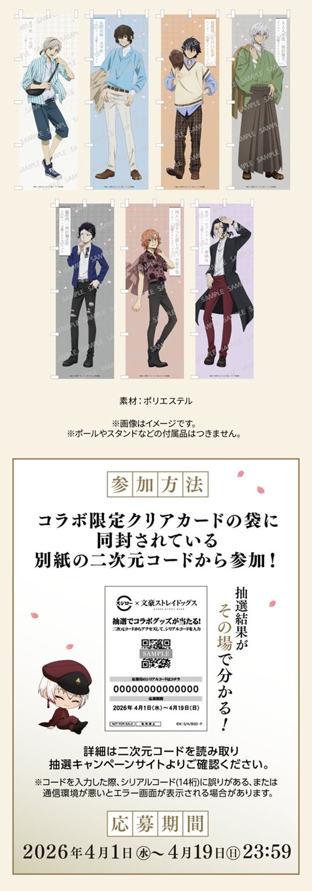 コラボ限定クリアカードの袋に同封されている別紙の二次元コードから抽選キャンペーンサイトにアクセスし、シリアルコードを入力すると抽選で100名さまに文豪ストレイドッグスコラボ限定等身大のぼり7種セットが当たるキャンペーンに参加できます。