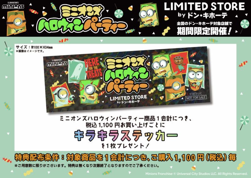 『ミニオンズハロウィンパーティー』関連商品を税込1,100円お買い上げ毎に、特典としてキラキラステッカーを1枚プレゼント!