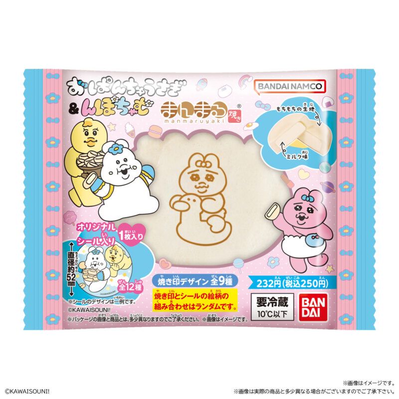 もちもちの今川焼きに、ミルク味のクリームが入ったスイーツです!今川焼きの表面には、おぱんちゅうさぎやんぽちゃむたちのかわいい表情やポーズの焼き印が押されています。笑顔や今にも泣きそうな顔など、それぞれ異なるデザインを楽しめます。(全9種)