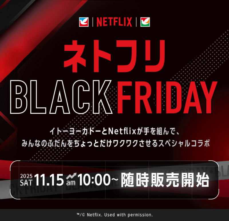 Netflixは、イトーヨーカドーとセブンイレブンのブラックフライデー企画の一環として、2025年11月15日(土)より、全国のイトーヨーカドーおよびセブン‐イレブンなどの店舗にて、Netflixとのコラボレーション商品、最大26アイテムを数量限定で発売します!