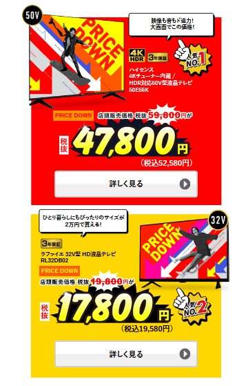 ・32型以上のテレビと同時購入で、対象のバースピーカーまたは壁寄せ型テレビスタンドがそれぞれ税抜価格から3,000円引き