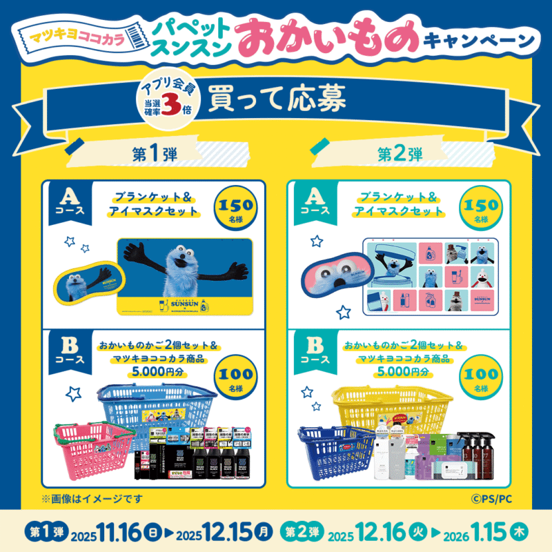 マツキヨココカラ「パペットスンスン おかいものキャンペーン」2025年冬~2026年1月のスケジュール、内容、販売状況、口コミについてまとめます。