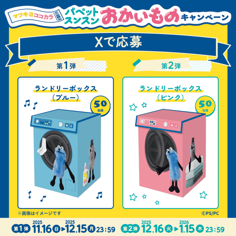「マツキヨココカラ×パペットスンスン」コラボが、2025年11月16日(日)より、全国のマツキヨココカラで実施します!コラボ限定のビジュアルを使用した限定グッズが当たる!もらえる!買える!