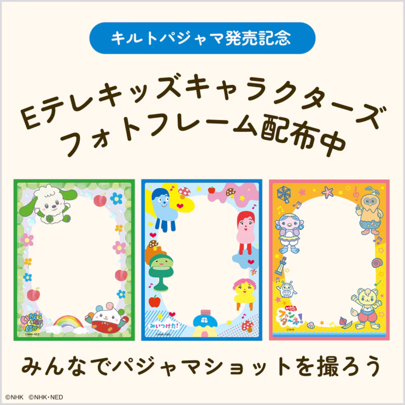 NHK Eテレの人気番組『いないいないばあっ!』『おかあさんといっしょ/ファンターネ!』『みいつけた!』。ベストフレンズをテーマに、子どもたちが大好きな3作品に登場する人気キャラクターたちで、柔らかな色味のキルトパジャマで販売します!