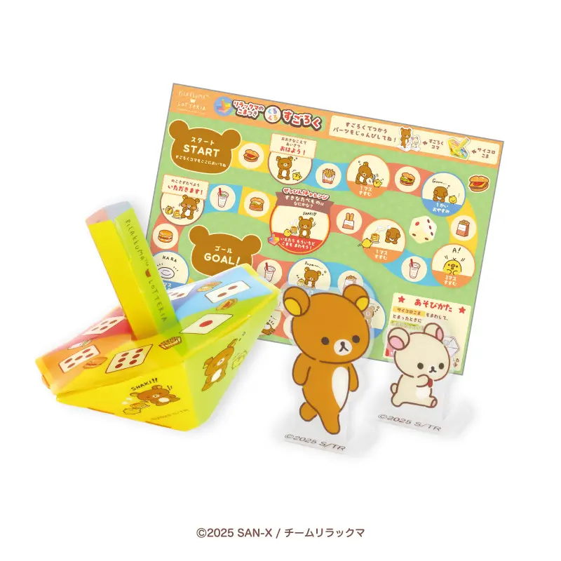 「リラックマおもちゃ」は、手紙を書いたり飾ったりできる「リラックマのテレビBOXつき おりがみレター」、シール遊びやだるま落としが楽しめる「リラックマのだいすきな ホットケーキだるま」、こまを回してすごろく遊びができる「リラックマのこまつき くるくるすごろく」の3種類から1種類をお選びいただけます。