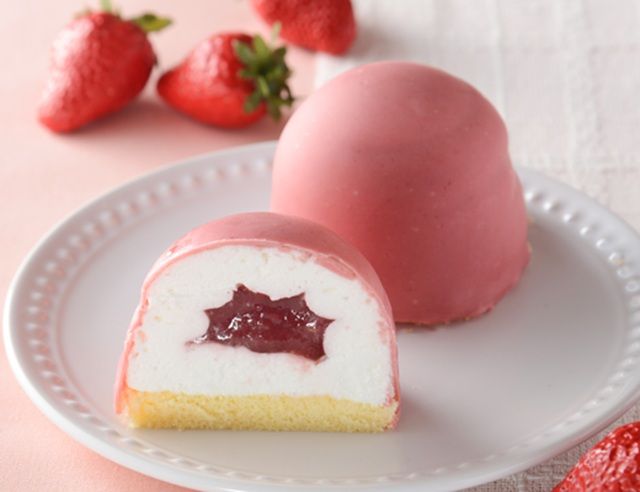 ICHIBIKOコラボ商品。いちごソース入りのミルククリームに、コーティングチョコを上掛けしたドーム状のケーキ。