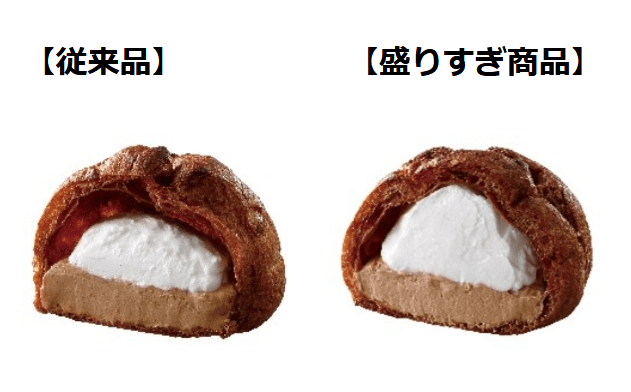 従来品「大きなチョコシュー」と比較して、クリーム(チョコクリームとホイップクリーム)を約50%増やしました。