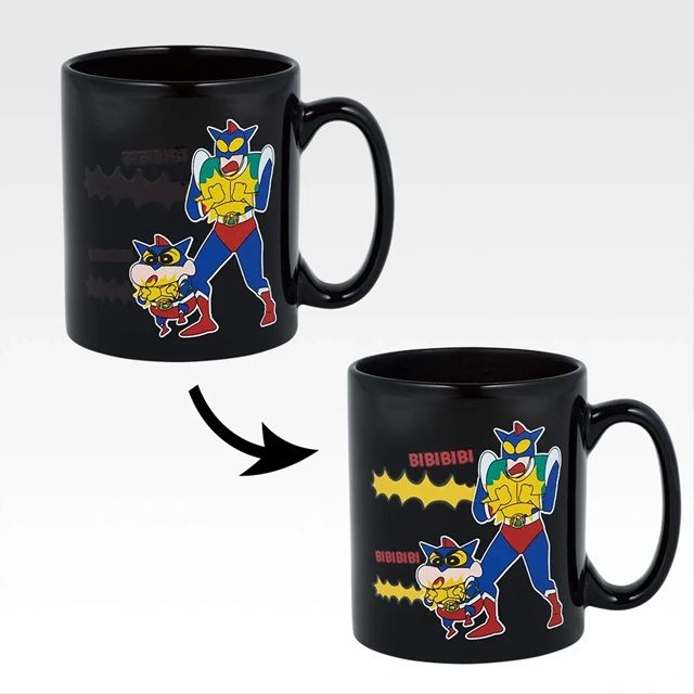 温かい飲み物を注ぐと、しんのすけとアクション仮面がアクションビームをするマグカップです!