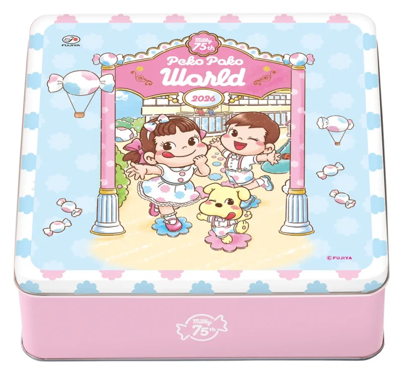 2026年に発売75周年を迎えるミルキーをモチーフにしたお菓子缶! 「ペコちゃんおたのしみ缶」