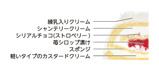 軽いタイプのカスタードクリーム、スポンジ、苺シロップ漬け、シャンテリークリームを重ね、練乳入りのまろやかなクリームで包んだドーム状のケーキです。食感のアクセントにシリアルチョコ(ストロベリー)をしのばせました。