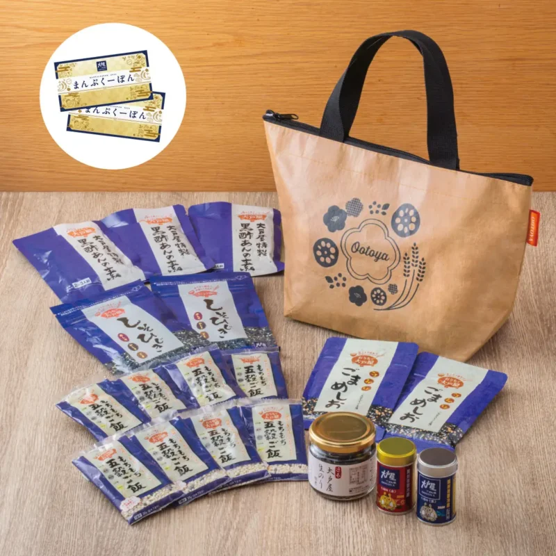 おうちでも大戸屋の味をお楽しみいただける人気のオリジナル商品や、全国の大戸屋ごはん処でご利用いただけるお得な「まんぷくーぽん」が入った、うれしい特典いっぱいの「大戸屋まんぷく袋」です。日本三大七味のひとつ”八幡屋礒五郎”とのコラボ七味は、2026年の干支をデザインした限定缶で登場。さらに今年は、新たに“小豆島産の海苔”を使用した「大戸屋 生のり佃煮」も仲間入りし、大戸屋のお弁当がぴったり入る「オリジナルお弁当バッグ」に詰め込みました。
