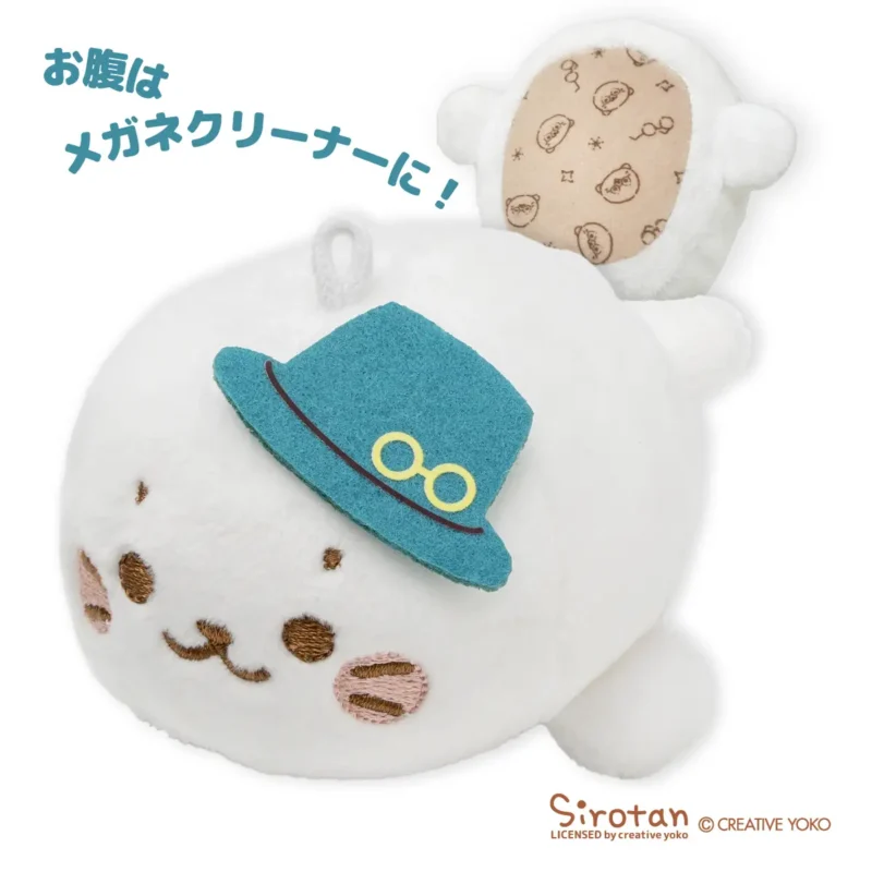 眼鏡市場の「見えるにエール隊」の帽子をかぶった『しろたん』のぬいぐるみ風メガネクリーナーです。おなか部分がオリジナル柄のクリーナー生地で、メガネだけでなくスマホ用クリーナーとしても使用可能です。