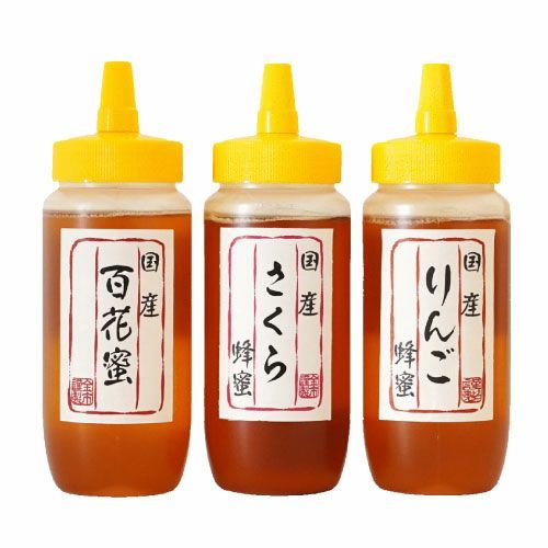 様々な用途でたっぷりとお楽しみください。国産りんご蜂蜜、国産さくら蜂蜜など。各480g×3本
