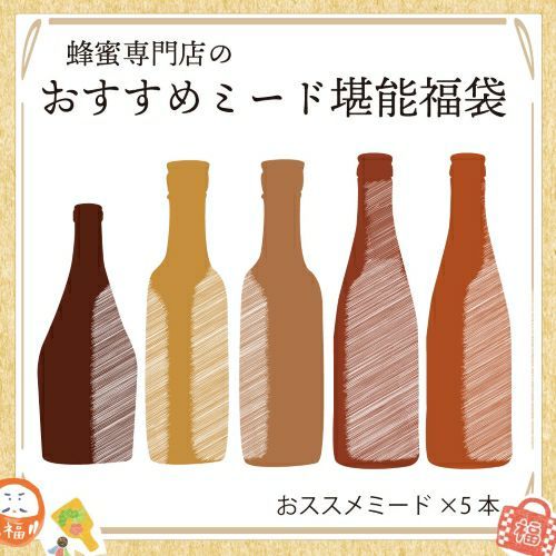 おすすめの国産ミード2本(250ml×2)・海外産ミード3本(250~750ml×3)が入ったミードがたっぷり堪能できる福袋。