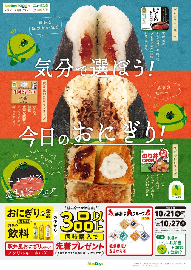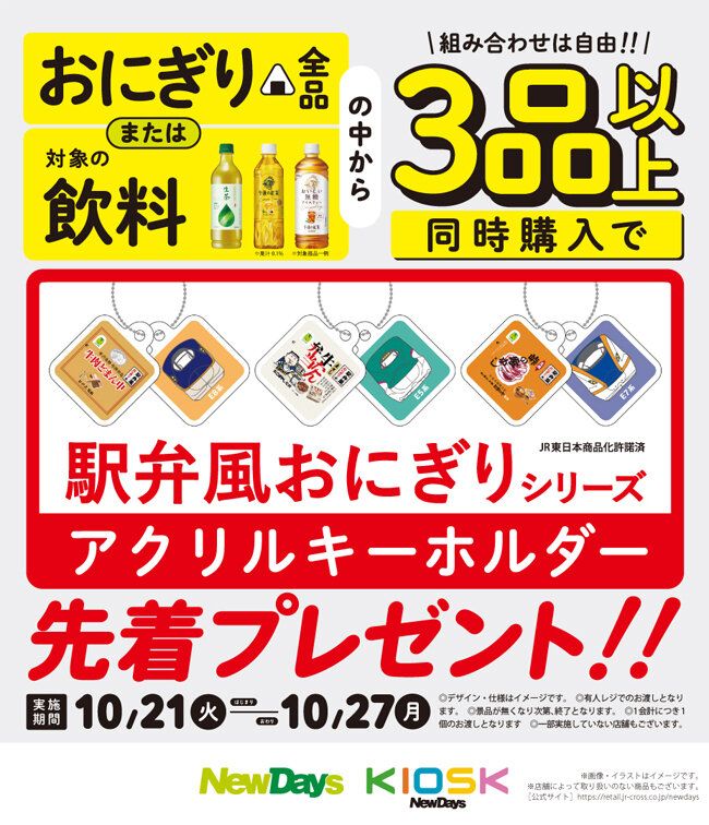 期間中、NewDaysでおにぎりまたは対象の飲料の中から合計3品以上を同時に購入すると、オリジナルデザインの「アクリルキーホルダー」を先着でもらえます!
