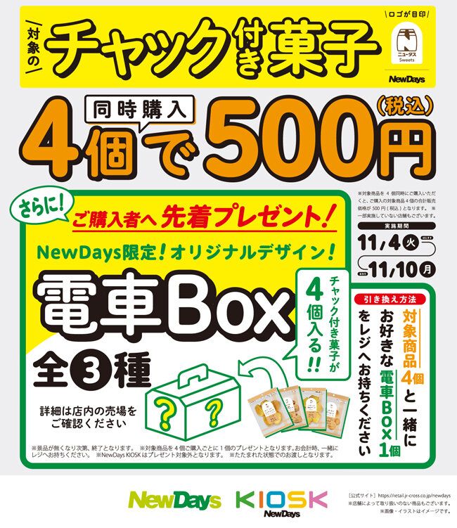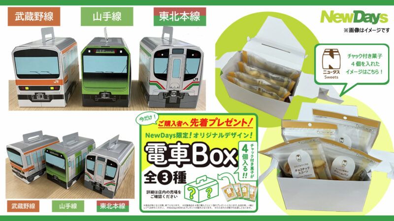 また、NewDaysでは対象のチャック付きお菓子を4個同時購入者に先着でチャック付きお菓子が4個入るNewDays限定・オリジナルデザインの電車BOXを先着でプレゼントします。