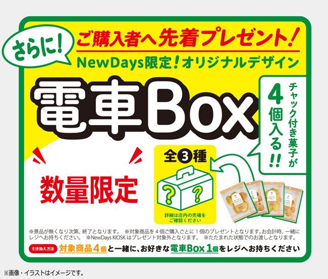 ②期間中、NewDaysでは対象のチャック付きお菓子を4個同時購入者に先着でチャック付きお菓子が4個入るNewDays限定・オリジナルデザインの電車BOXを先着でプレゼントいたします。
