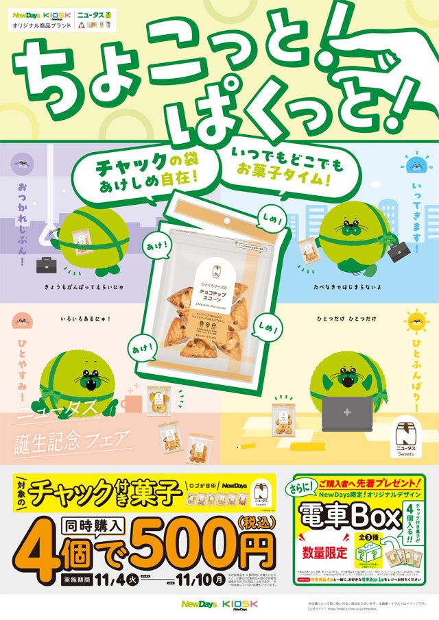 6週目はフェア第六弾として、2025年11月4日(火)~11月10日(月)の期間中、NewDays・NewDays KIOSKで対象のチャック付きお菓子の中から合計4個を同時に購入すると、4個で500円(税込)になります。