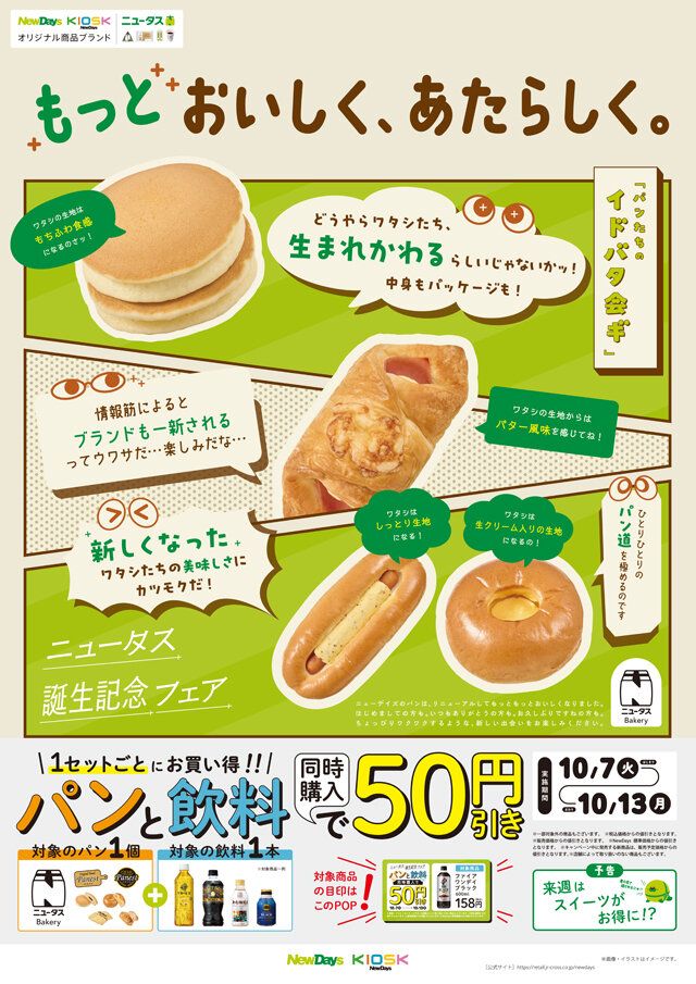 2週目はフェア第二弾として、2025年10月7日(火)~10月13日(月)の期間中、対象のパン1個と対象の飲料1本を同時に購入すると、50円引きになるキャンペーンを実施します!