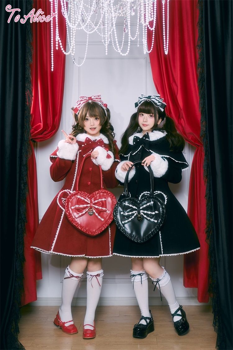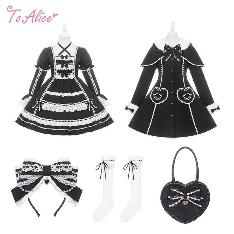 襟元とお袖がファー素材のコート、ビジューリボン付きのワンピース、ヘッドドレス、ソックス、ハートのフリルトートバッグの計5点!